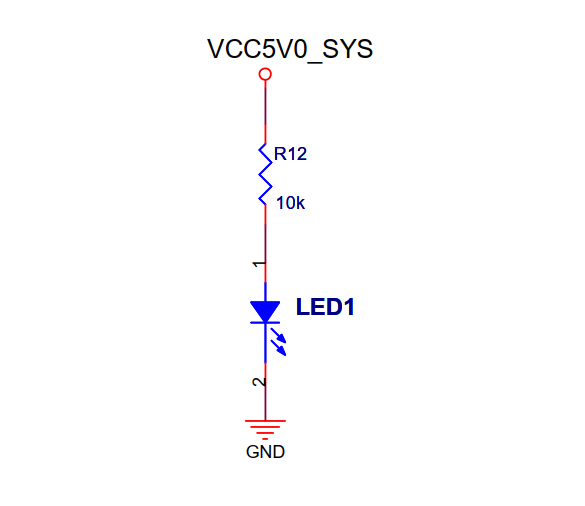 LED1串联了一个10kΩ的电阻,这个电路图贼简单,电阻主要是分压限流的作用,这个LED是红色的