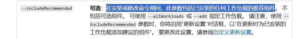 参数--includeRecommended指定工作负载的组件配置,以下是微软官网的解析