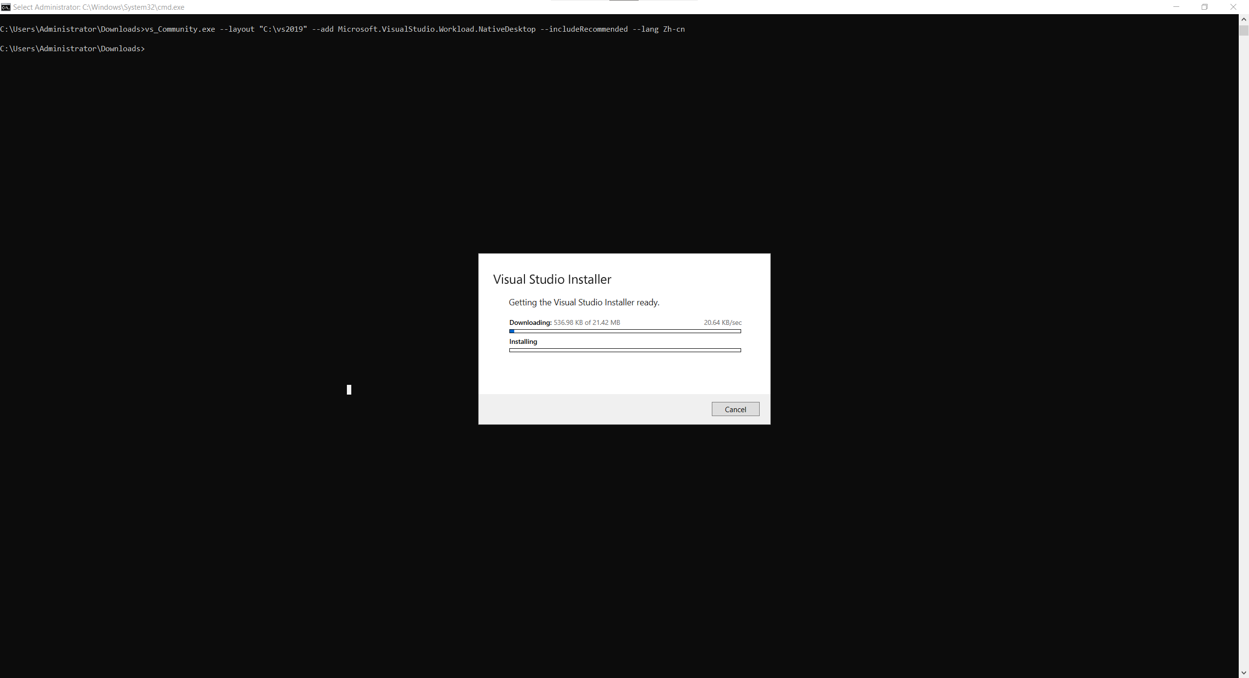 1 | vs_Community.exe --layout "C:\vs2019" --add Microsoft.VisualStudio.Workload.NativeDesktop --includeRecommended --lang zh-CN |